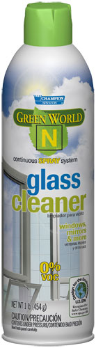 Champion Sprayon® Green World N® Glass Cleaner utilizes environmentally preferable chemistry to clean and shine glass, plastic and plexiglass. Naturally, this glass cleaner meets all EPA requirements for Safer Choice labeling. It uses a natural, nonflammable propellant. It is made from biodegradable ingredients, was not tested on animals, contains no harsh chemicals, and leaves no residue or fumes. Green World N® Glass Cleaner has zero percent VOCs. It does not contain CFCs or other ozone-depleting substances. The container is made with a minimum of 25 percent recycled steel and is 100 percent recyclable in communities that accept aerosol cans for recycling.